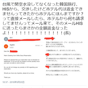 台風で韓国旅行に行けなくなるもhisがホテル代は返金出来ないと返事